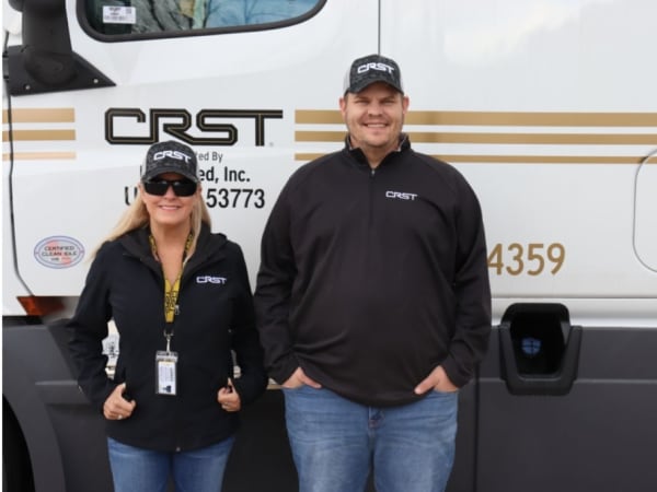 CRST International, Cedar Rapids, Iowa, partnered with Central Furniture Rescue to help deliver furniture donations, such as chairs, couches, and cushions, to the Cedar Rapids area after a derecho storm devasted the community. Pictured are Chris Landwehr and Kendall George, the CRST drivers who picked up the donated furniture.