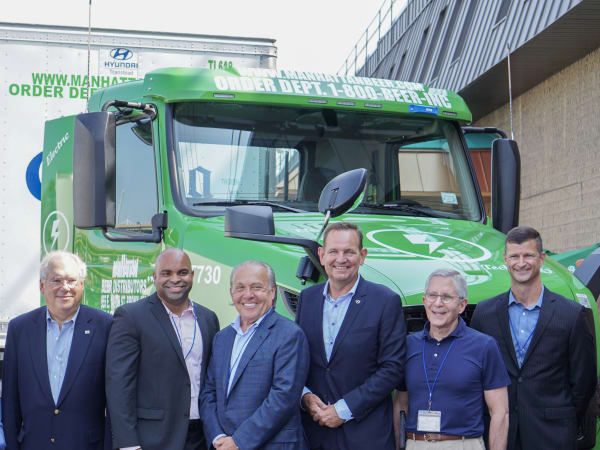 Left to right: NYC DOT Commissioner Henry Gutman; Juan Corcino, senior director of fleet operations and sustainability at Manhattan Beer; Simon Bergson, CEO of Manhattan Beer; Peter Voorhoeve, president of VTNA; Barry Milea, president of Milea Truck Sales and Leasing; and Allen Goetz of Gilbarco Veeder-Root.