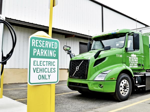 Manhattan Beer began building its low-emission fleet in the 1990s, which today includes more than 160 Volvo VNR and VNL compressed-natural-gas Class 8 trucks (shown parked behind the electric charging station).