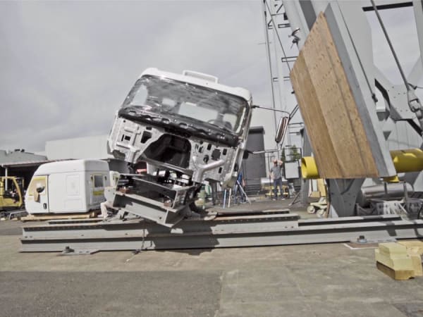 The Western Star 49X was tested at the structures lab at DTNA, including this cab-crush test.