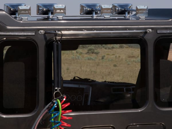 From the back of the Western Star 49X cab, you can see the three-piece windshield and the way the trough roof allows the cab to be higher over the doors without adding overall height to the truck.