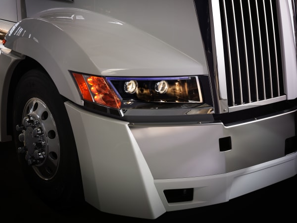 Western Star designers call the bumper end caps "fangs." They are integral to the truck's aerodynamics in that they guide air up and over the fender as well as around the wheel. A physically small but highly effective bit of aerodynamics, Western Star says.