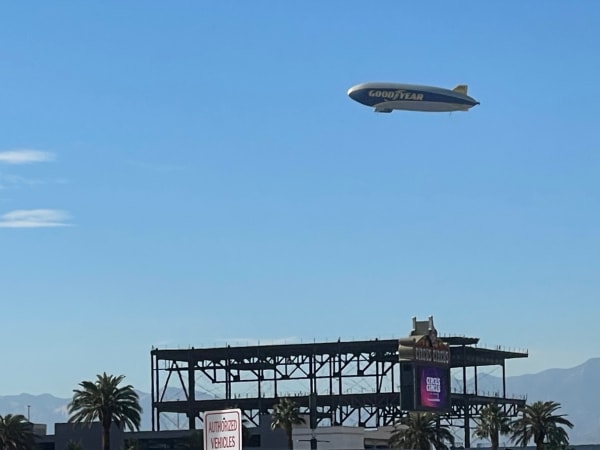 The iconic Goodyear blimp cruises over Las Vegas during CES 2024.