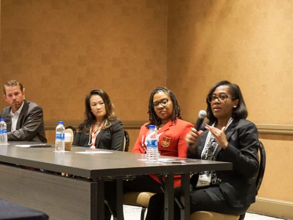 (Left to right) Ryan McDaniel of Walmart, Laon Mansy of Clean Harbors, Shanay Lewis of XPO Logistics, and Mauryo Jones of Ryder Systems discuss how to build a corporate culture that promote longevity for women in the workplace.