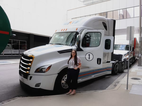HDT Managing Editor Vesna Brajkovic poses next to Freightliner's Cascadia Sleeper.