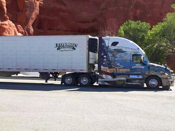 Leonard's Express driver Mike Holder is ready to go in his specially wrapped truck honoring his service as a United States Marine.