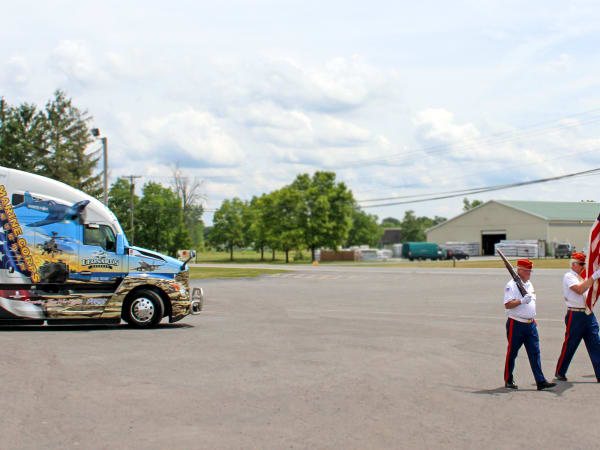 A veteran honor guard leads one of the Leonard's Express Marine Corps trucks out during its presentation ceremony to veteran and driver Mike Holder.
