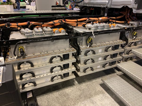 These batteries on the Freightliner eCascadia are usually under cover, but TMC attendees got a chance to see them on an engineering test truck.
