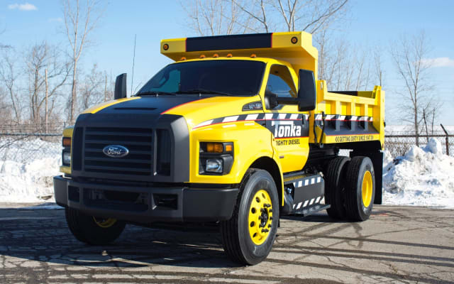 The Ford F-750 Tonka, which is built on the 2016 Ford F-750, was created by Ford and Tonka. It's powered by a 6.7l Power Stroke V-8 diesel engine with working dump body from Truck Tech Engineers and a 33,000-pound gross vehicle weight rating.