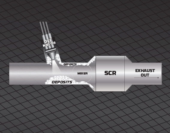 Diesel exhaust fluid can cause deposit buildup in SCR systems.
