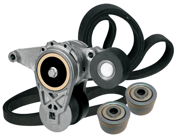 Dayco’s heavy-duty serpentine belt kits include a two-piece tensioner, two pulleys and two serpentine belts in the appropriate length and width.