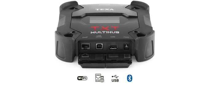 The Texa IDC5 software communicates with the TXT Multihub unit through a Wi-Fi module for the diagnostic operations that use RP1210 (HD pass-thru protocol), standard CAN, CanFD and DoIP protocols; a network cable (Ethernet) reserved for DoIP operations (ISO 13400); a Bluetooth module for conventional diagnoses; a USB socket for all types of diagnosis, including the Pass-Thru (SAE J2534-1 and SAE J2534-2).