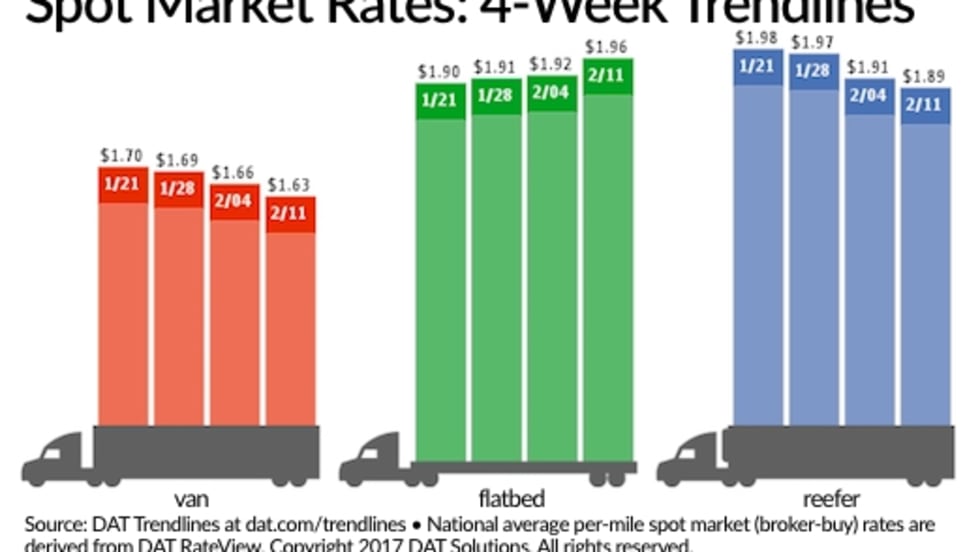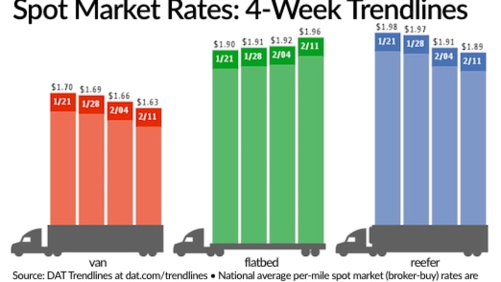 Spot truckload freight rates appear to have stabilized after flatbeds trended slightly higher the past few weeks while vans and reefers moved downward, according to new figures from the freight matching service provider DAT Solutions.