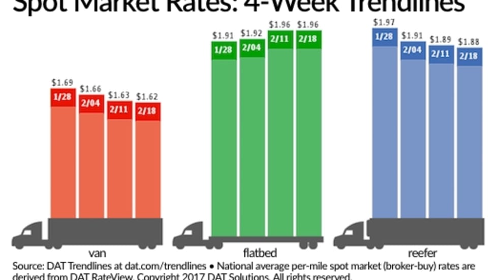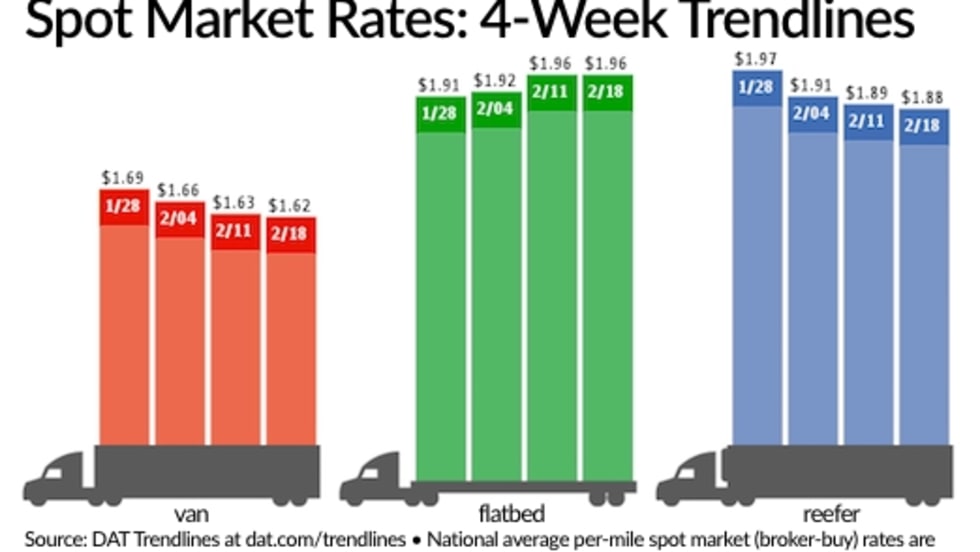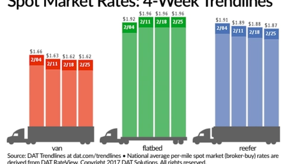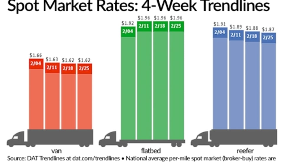 Spot truckload freight volumes improved a bit during the week ending Feb. 25 thanks to a 7% gain in flatbed load posts, according to DAT Solutions and its network of load boards, but rates were virtually unchanged.