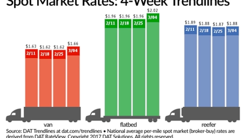 Spot truckload freight volume jumped 17% for the week ending March 4 compared to the previous week while rates responded with the first week-over-week increase in national averages in more than a month, according to DAT Solutions and its network of load boards.