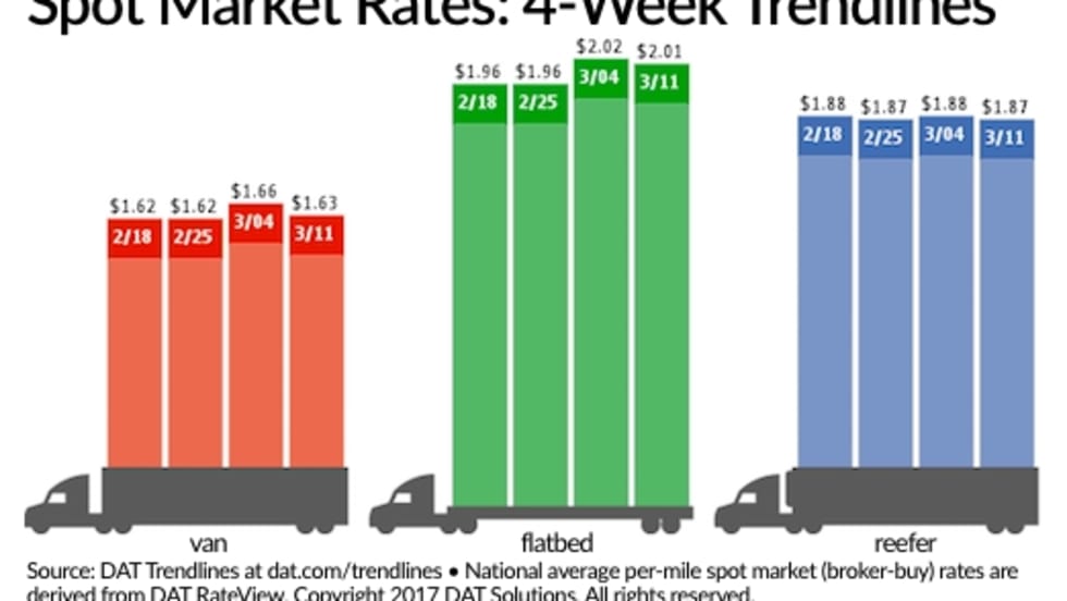 After a 17% jump the previous week, spot truckload freight volume increased a modest 1.3% during the week ending March 11 while rates gave back at least part of their gains from the week before, according to DAT Solutions' network of load boards.