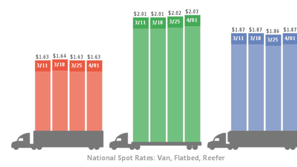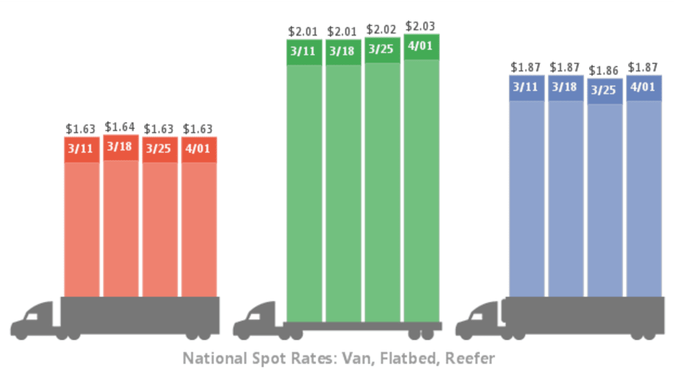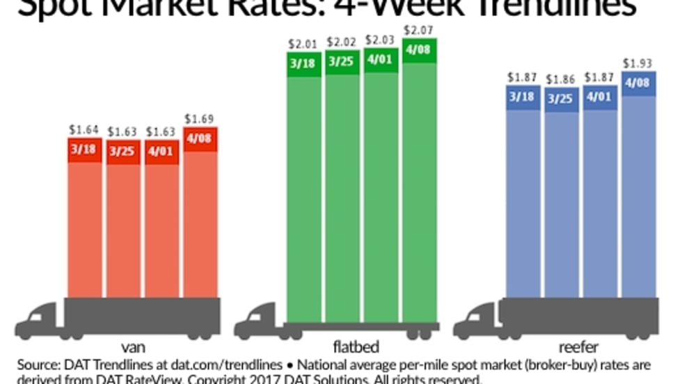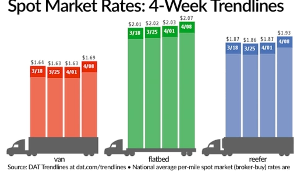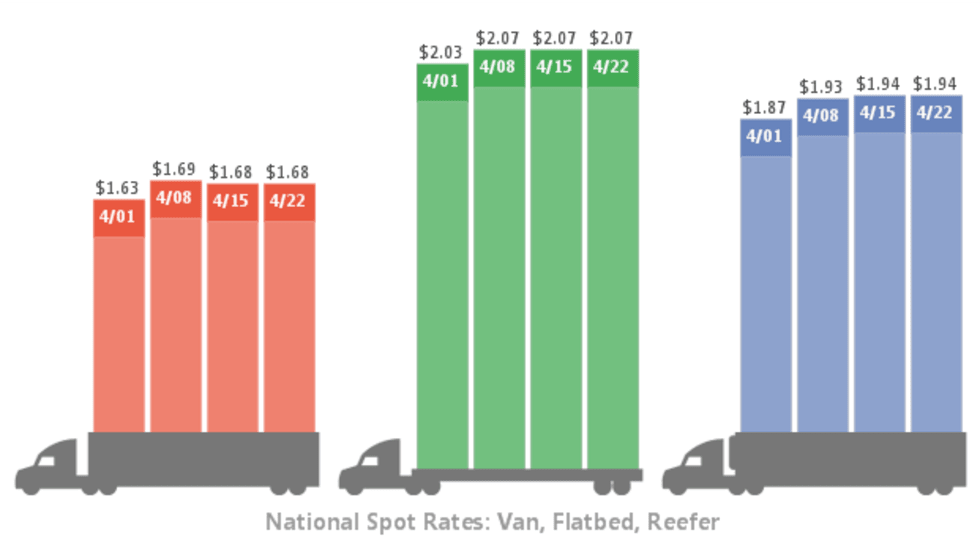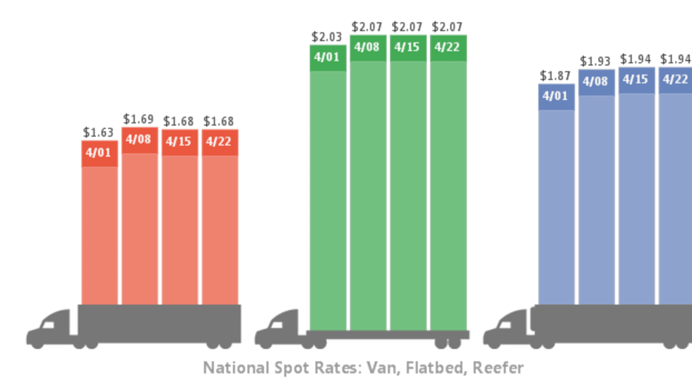 National average spot truckload rates for van, reefer, and flatbed freight all held steady for the week ending April 22, while prices in many major freight markets continued a slow springtime climb, according to DAT Solutions and its network load boards.