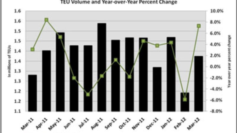 Driven by a surge in furniture and auto parts shipments to the U.S., containerized imports in March rose 7.3% over 2011. This increase to 1.37 million 20-foot-equivalent units came on the heels of a 5.9% decline in February