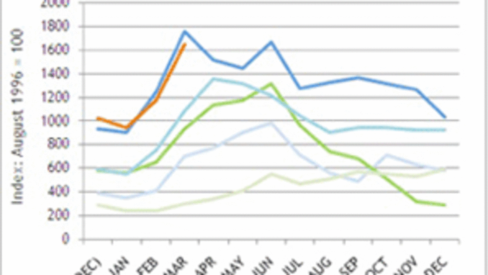 Freight availability and rates on the spot market increased month-over-month and declined slightly year-over-year, according to TransCore's DAT North American Freight index. The index rose 40% from February to March but was down 6.1% compared to March 201