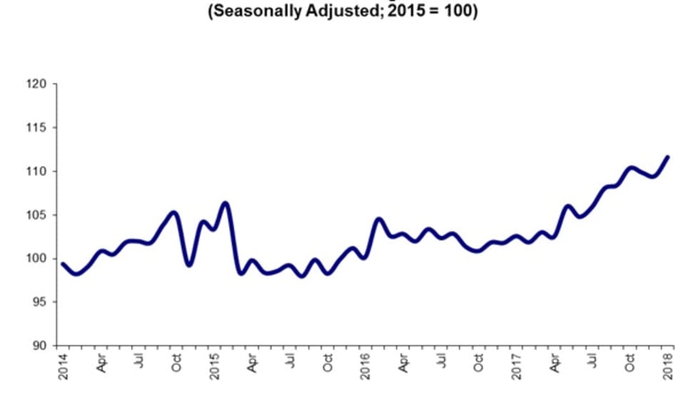 A measure of the nation’s freight market showed gains in both spending and shipments during the fourth quarter of 2017, but the strength of the advances differed widely.