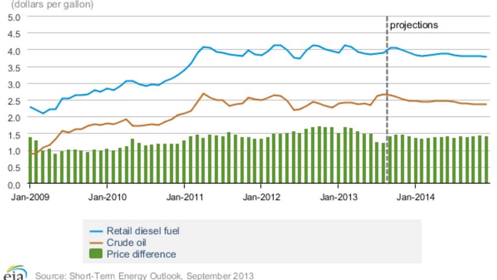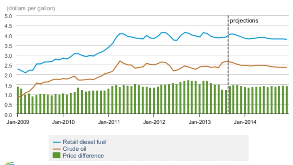 A new government forecast is calling for diesel prices to average just below the same level this year as it was in 2012 and ease a little further next year.
