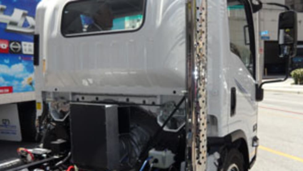 A chrome-plated exhaust stack emits a muted whoosh as this truck's turbine engine spins at tens of thousands of RPMs, drawing the curious among attendees at this ride-and-drive event in downtown Long Beach, Calif.