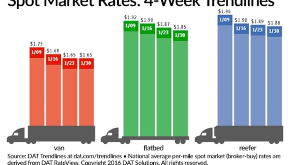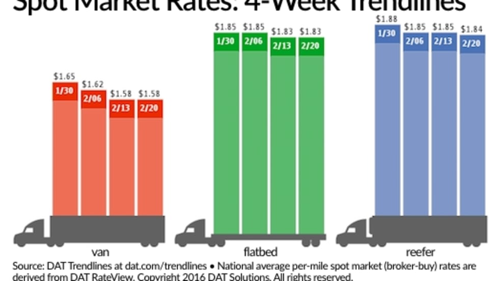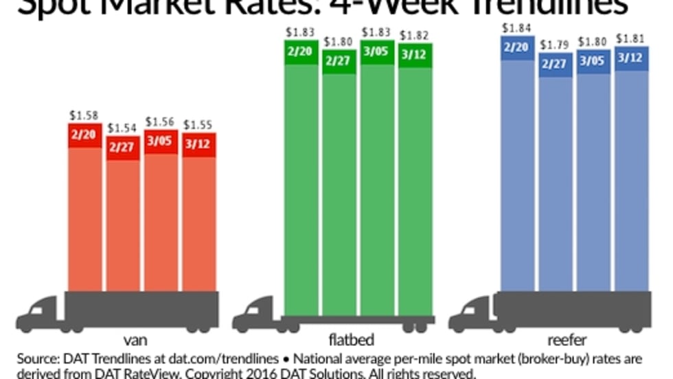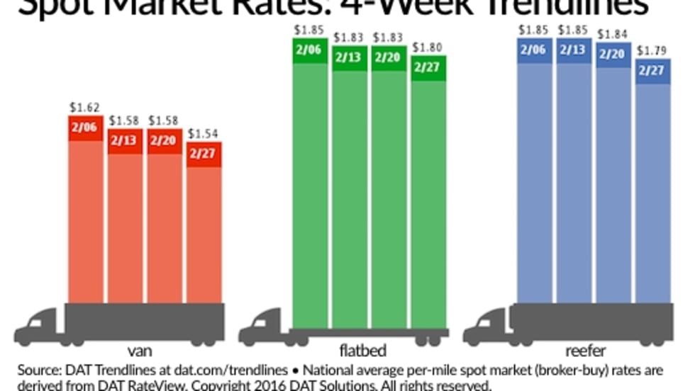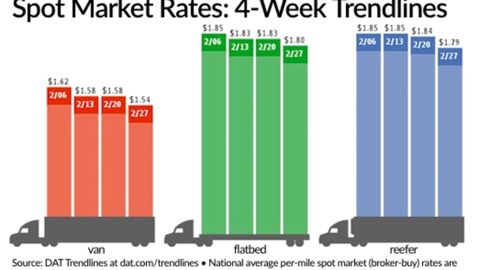 Despite greater demand for truckload services, national average van, reefer, and flatbed freight spot rates all slipped for the week ending February 27 compared to the previous week, according to DAT Solutions and its network of load boards.
