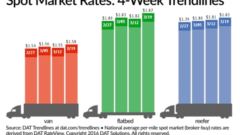 Following a dismal February performance, Spring has sprung on the spot freight market, with rates moving higher in all three trucking categories for the first time in several weeks.