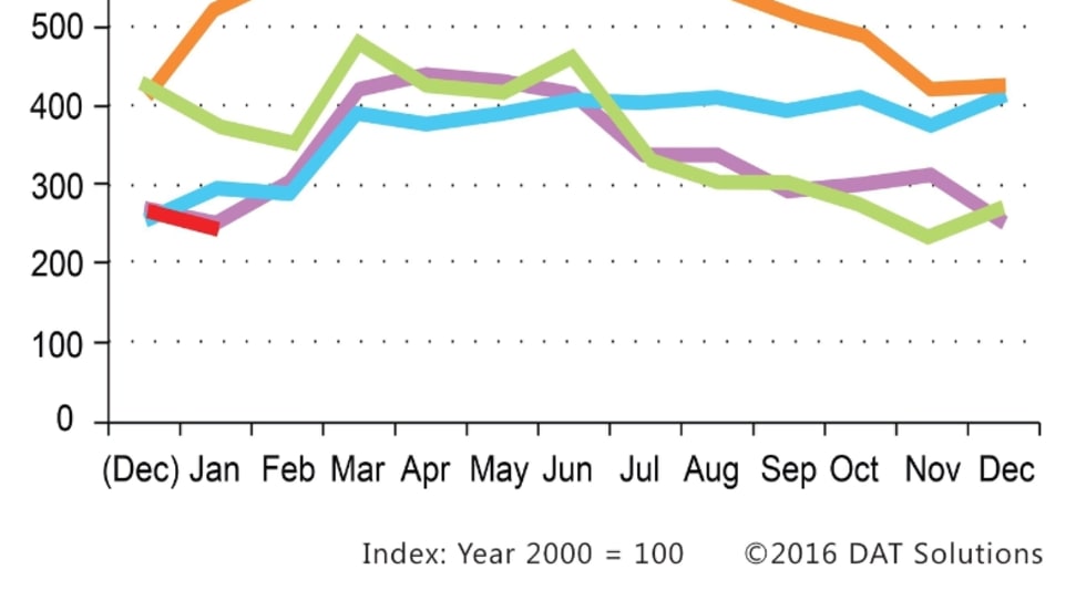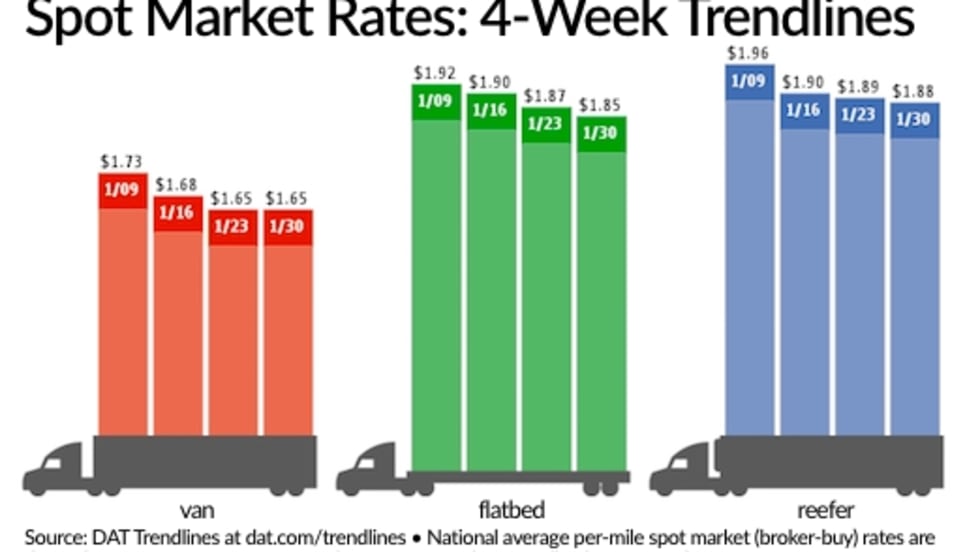 Load-to-truck ratios on the spot truckload market got a bump during the week ending Jan. 30, possibly due to pent-up demand after the previous week’s storms, but that failed to materialize into better freight rates which also came in lower for the entire month.