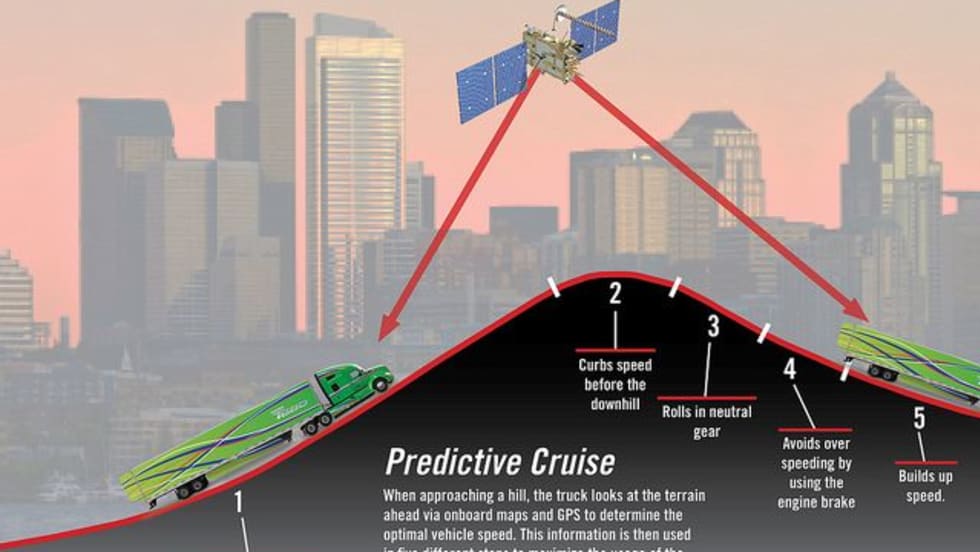 Predictive cruise control uses terrain mapping and GPS satellite locating to manage the engine and transmission for efficient operation on up- and downgrades.