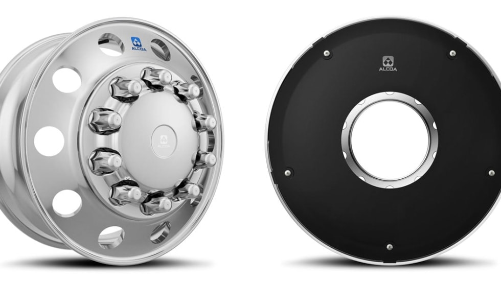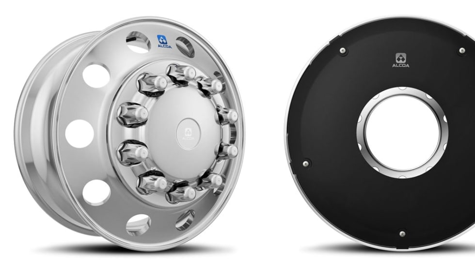 A steer wheel cover and a drive wheel cover plus wheel add aerodynamic and fuel-saving advantages to Alcoa wheels.