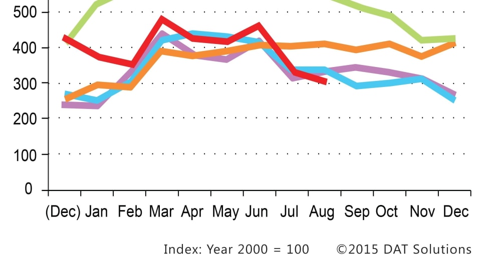 Freight volume followed a common seasonal pattern of declining in August on the spot freight market as linehaul rates also moved lower, pushing the latest DAT North American Freight Index down for the second straight month.