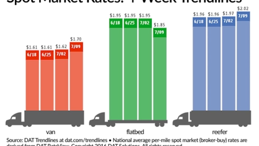 Spot truckload freight rates showed either a big improvement or turned in a disappointment over the past week while a monthly gauge of the market reveals its best performance of the year, according to DAT Solutions and its network of load boards.