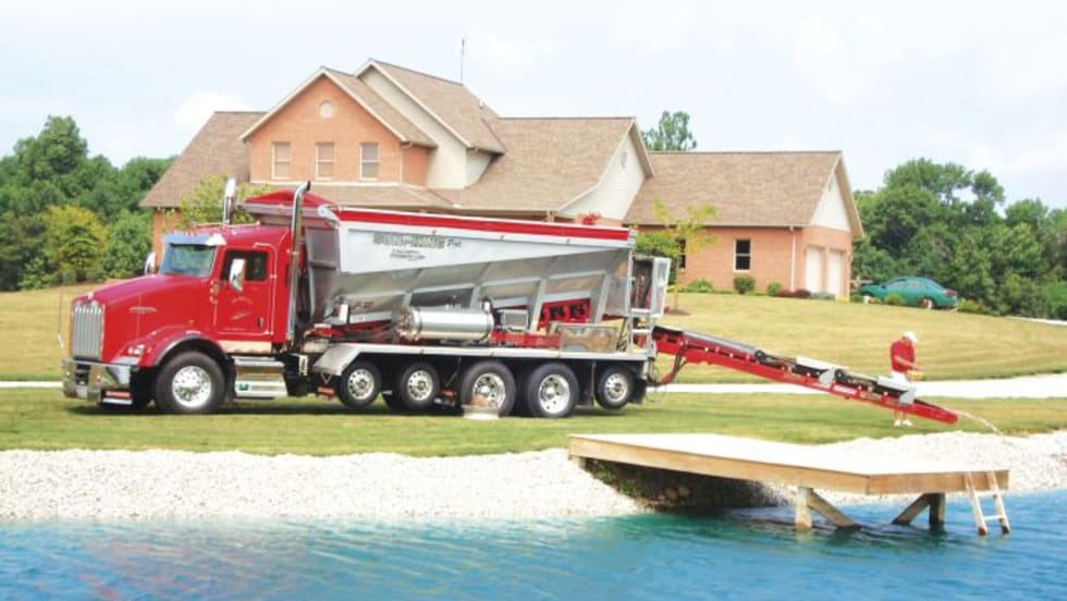 Dump trucks can do a lot of hauling and delivery work, but there’s a limit to how precisely certain loads can be placed. One alternative is the “slinger,” which adds a high-capacity conveyor-belt mechanism to a hopper body.