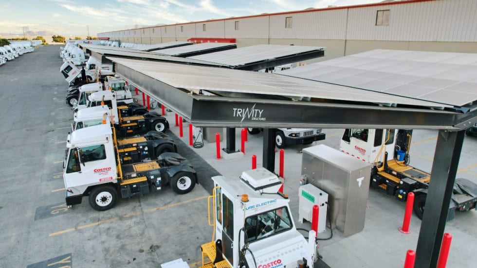 Costco is charging battery-electric yard tractors with off-grid electrified structures at its distribution center in Mira Loma, California. The integrated charging system by Trinity Structures was completed and in operation in just four months.