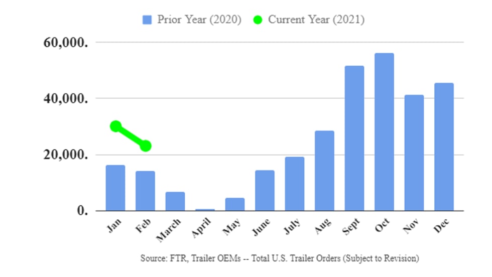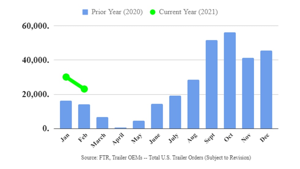 While preliminary reports indicate trailer orders in February fell 23% since January to a total of 23,100 units, order activity remained consistent with seasonal trends, according to FTR.