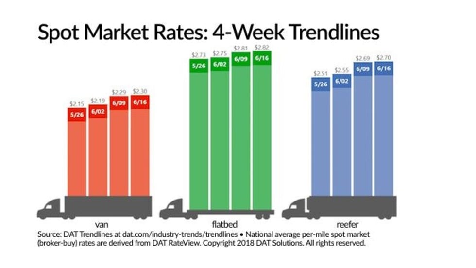 Spot truckload rates on the DAT Solutions network of load boards rose again for the week ending June 16 and are on track to achieve the highest ever monthly average for van, refrigerated, and flatbed freight.