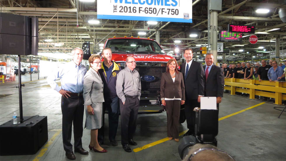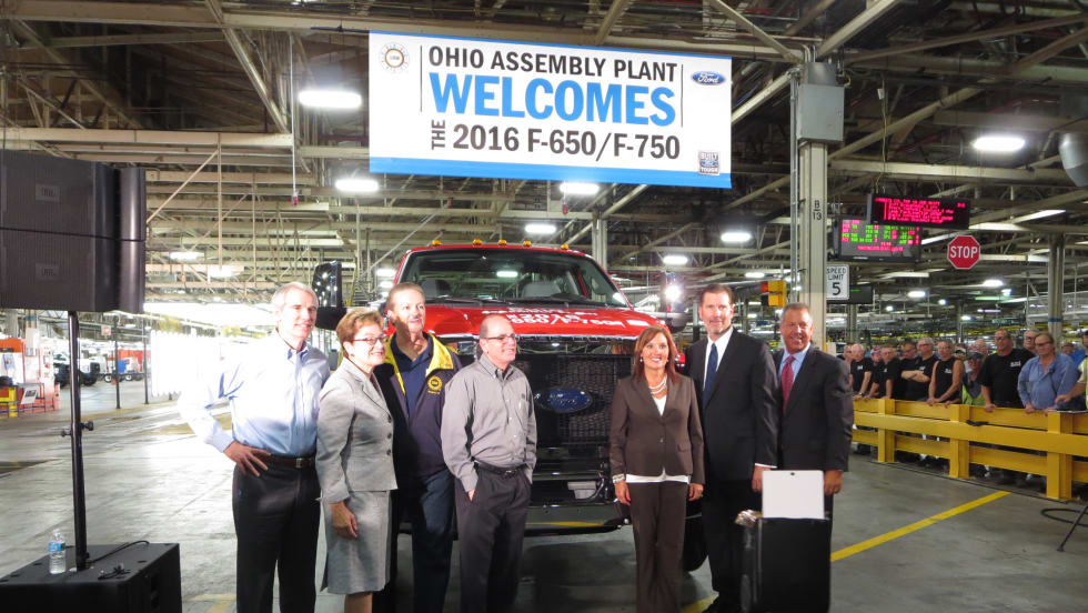 Ford and United Auto Workers officials Wednesday morning drove the symbolic first unit of its new F-650/750 series off the line at its Ohio Assembly Plant near Avon Lake amid cheers that followed congratulatory speeches.