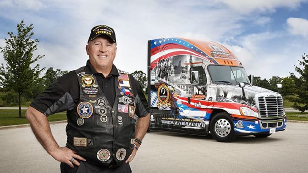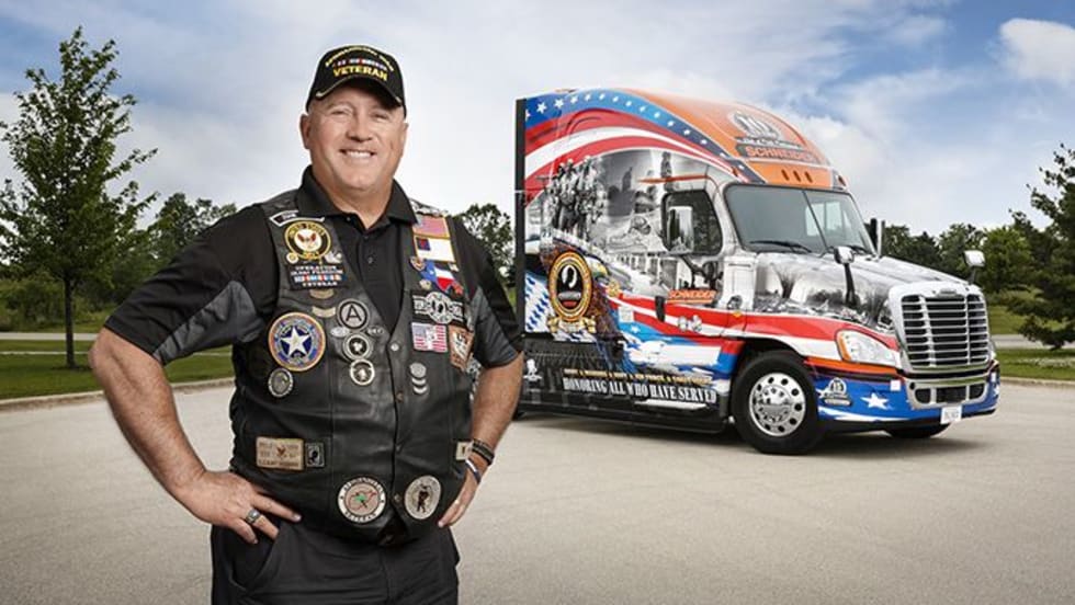 Schneider has been selected to receive Freightliner’s Ride of Pride truck and has chosen David Price, a Navy Reserve veteran who completed tours in Kuwait and Afghanistan, to drive the military-themed vehicle.