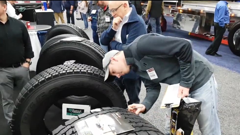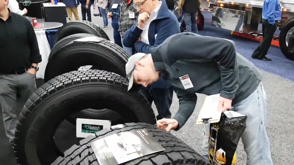 David Stevens, managing director of the Tire Retread & Repair Information Bureau, explained the purpose behind the group's annual Spot the Retreads contest at the 2018 Mid-America Trucking Show. Participants had to spot which tires were new and which were retreads from a set of 10 different tires.