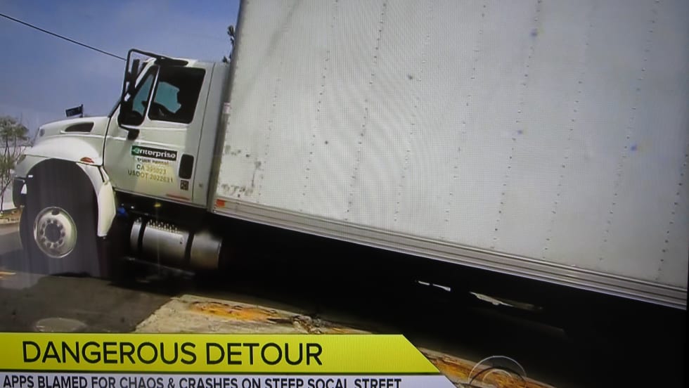 The grade's apex is unnerving, and can hang up long vehicles, like trucks and semis. Residents want Waze, which has directed traffic in this direction, to wave off this route.