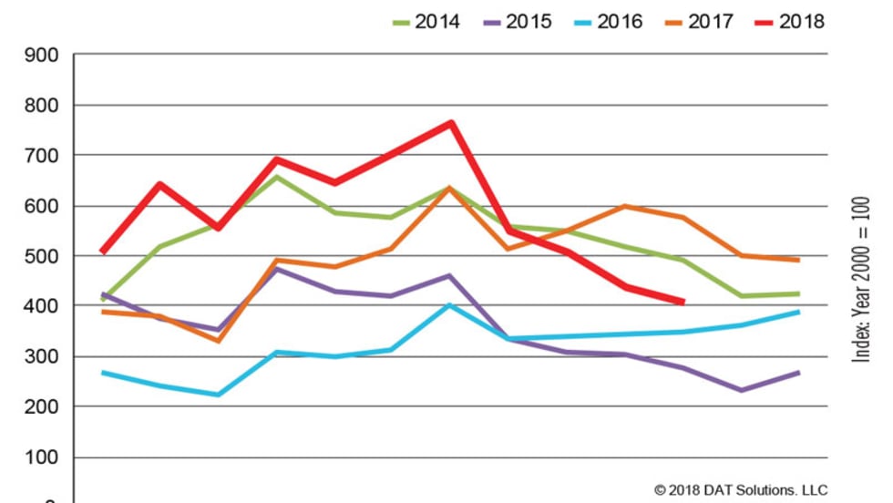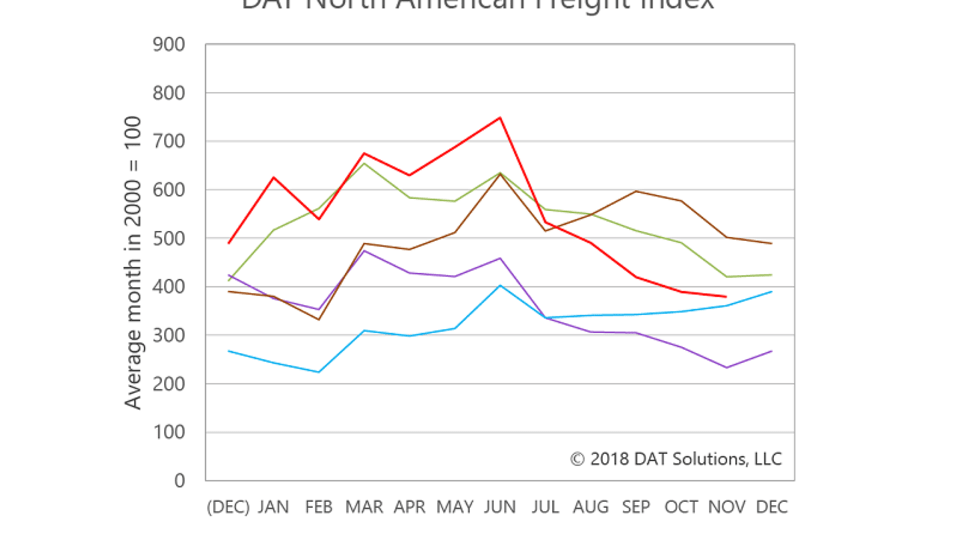 Spot market freight volume and rates fell for most equipment types last month, but holiday shipping is expected to give it a boost.
