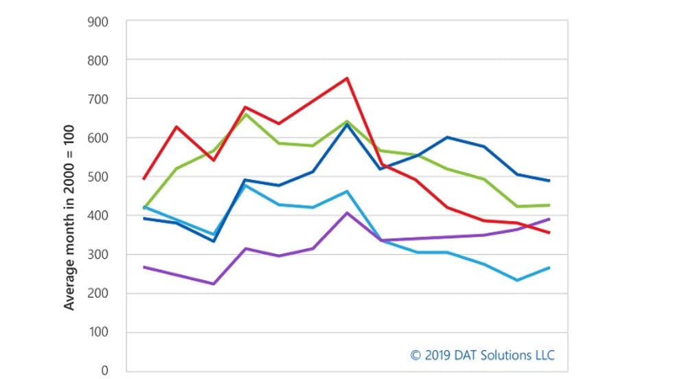 Load availability on the spot market has been trending downward since August 2018, as capacity loosened and trucks became more available.