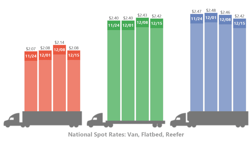 The spot market has not enjoyed the usual boost provided by holiday shipping so far in December, with spot market rates falling for all three major trailer types.