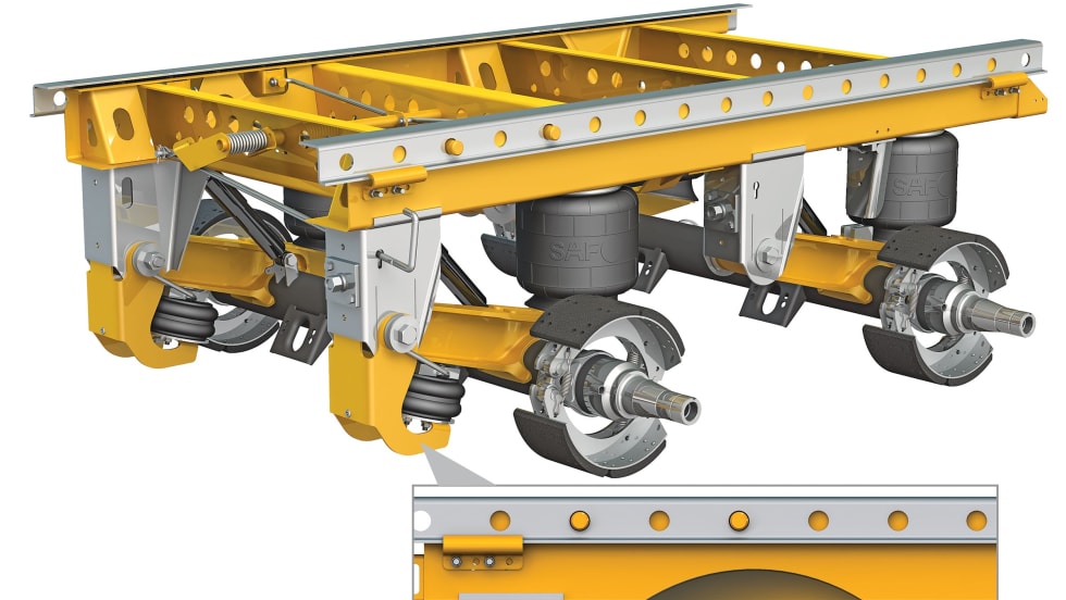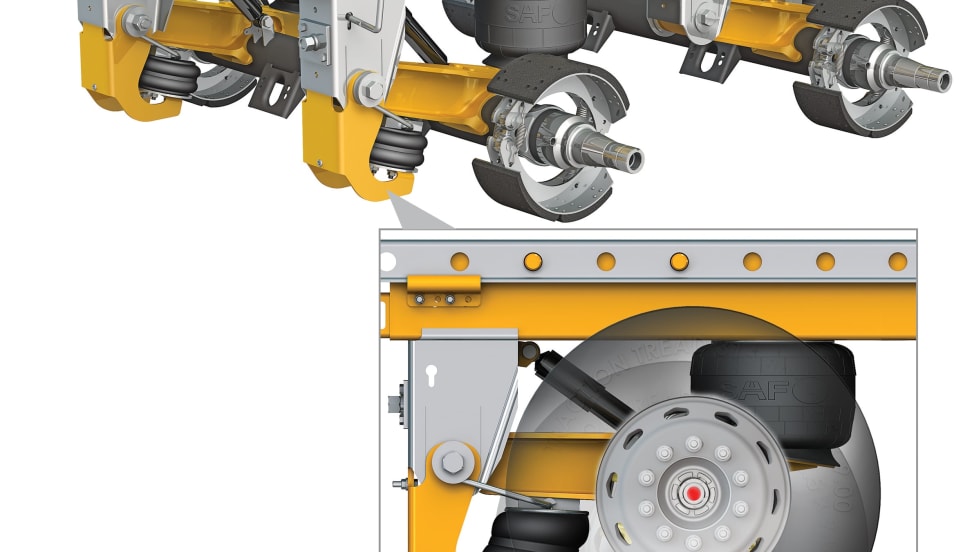 SAF-Holland is now offering Auto-PosiLift Axle Lift technology as an option on SAF CBX40 Tandem Axle Slider Suspension systems. The Auto-PosiLift combines the CBX PosiLift axle lift feature with a unique electronic control unit and air valve system on a tandem slider suspension to provide an automated axle lift function.