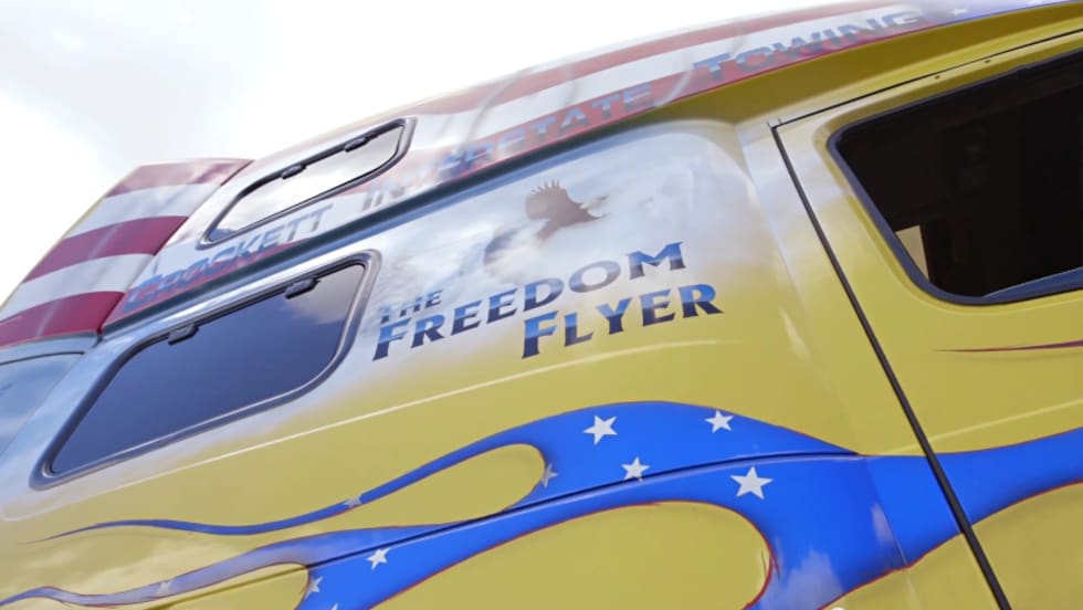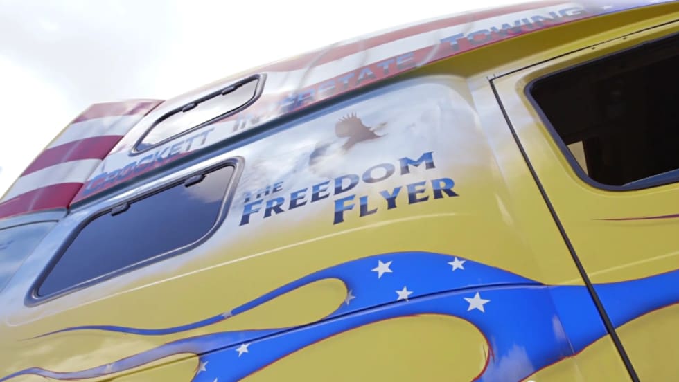 In the latest installment of the Volvo Trucks web series Welcome to My Cab, Tim Baumgartner, owner of Crockett's Interstate Towing, shows off his patriotic Volvo VNL called "The Freedom Flyer." Emblazoned with the American Flag, bald eagles and soldiers, the Vietnam veteran's truck has won several awards and participates in many parades.