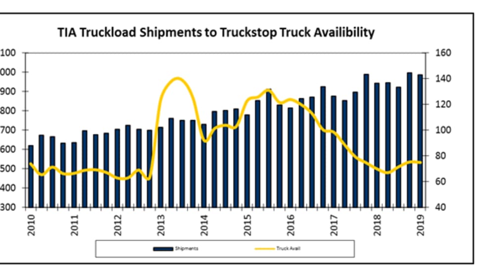 The third-party logistics market is volatile and in decline from a cyclical peak, according to a new quarterly report issued by the Transportation Intermediaries Association.