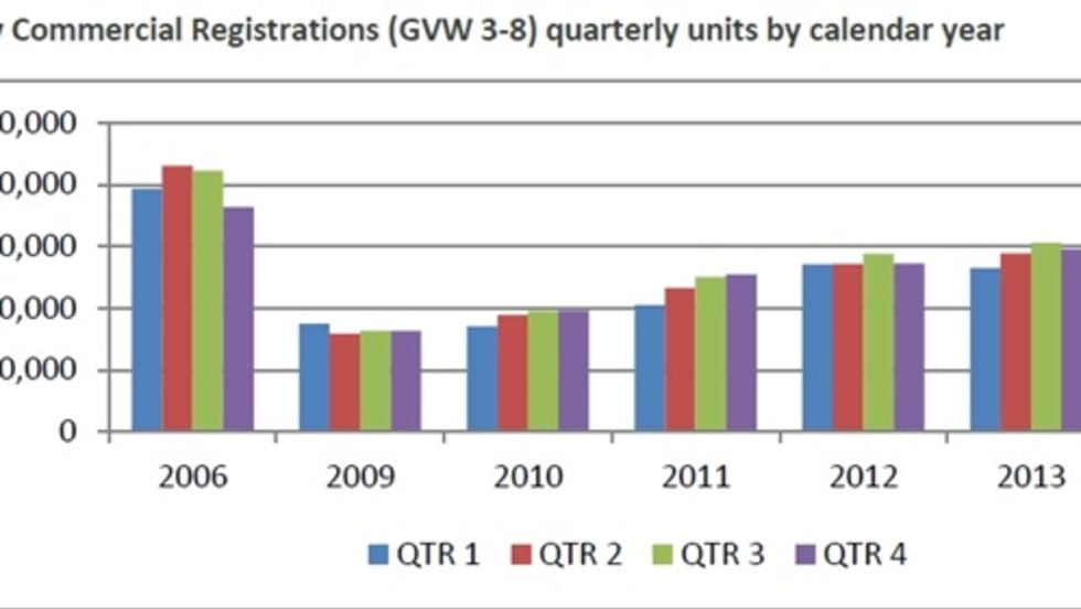 New commercial vehicle registrations in classes 3-8 for the first nine months of the 2013 were 426,718 units, up 2.8% from the same period in the 2012, according to a new report from IHS Automotive/Polk.