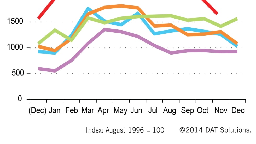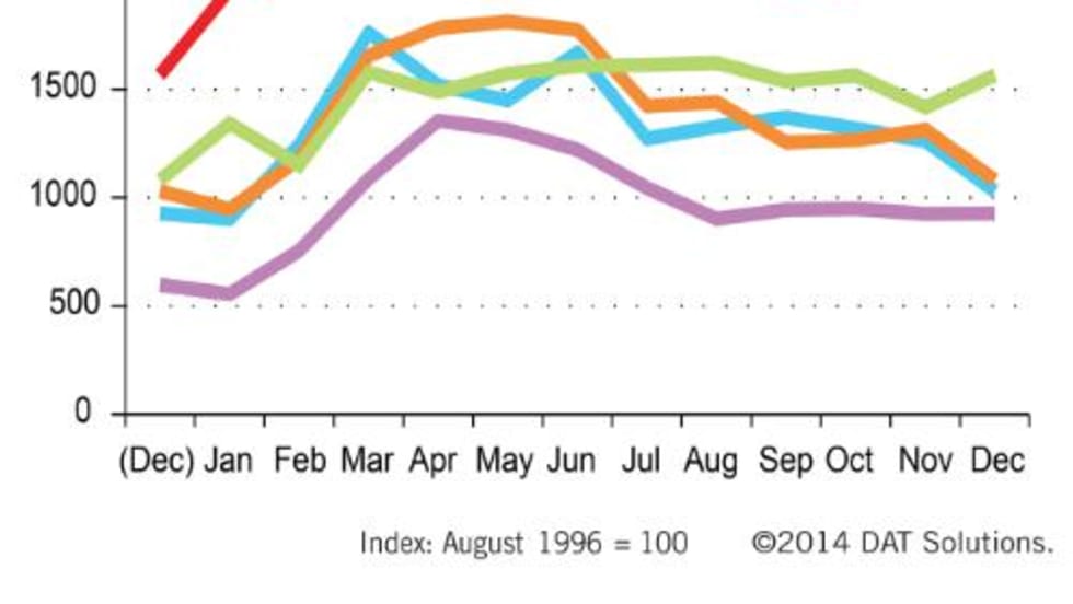 Spot market freight rates have posted slight gains, but one sector continues to see rates slide, according to the freight matching service provider DAT Solutions.