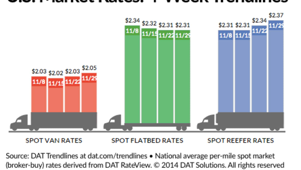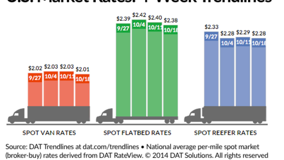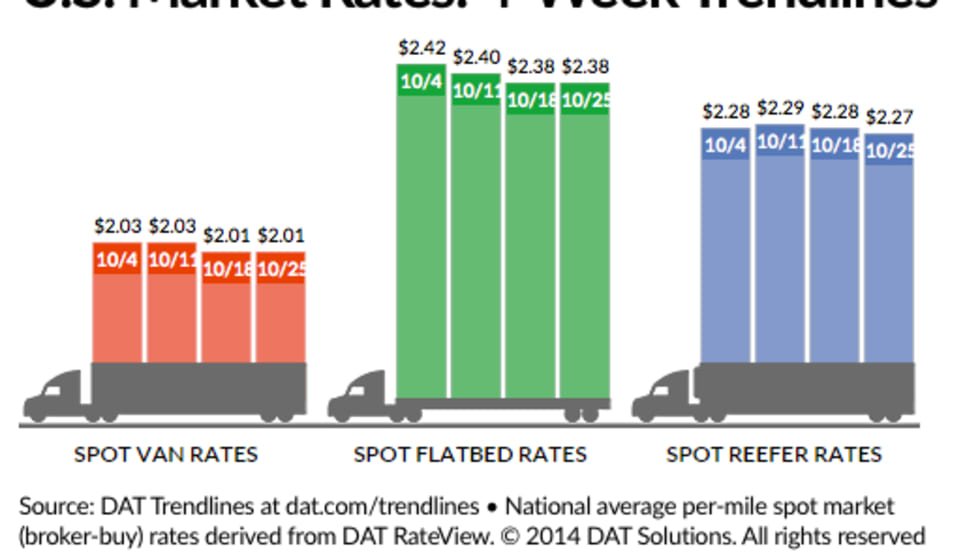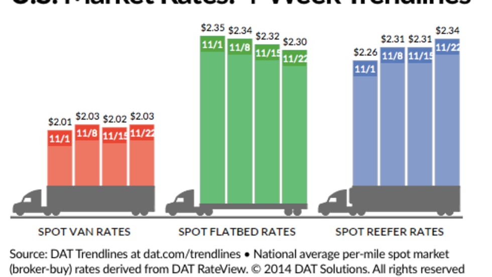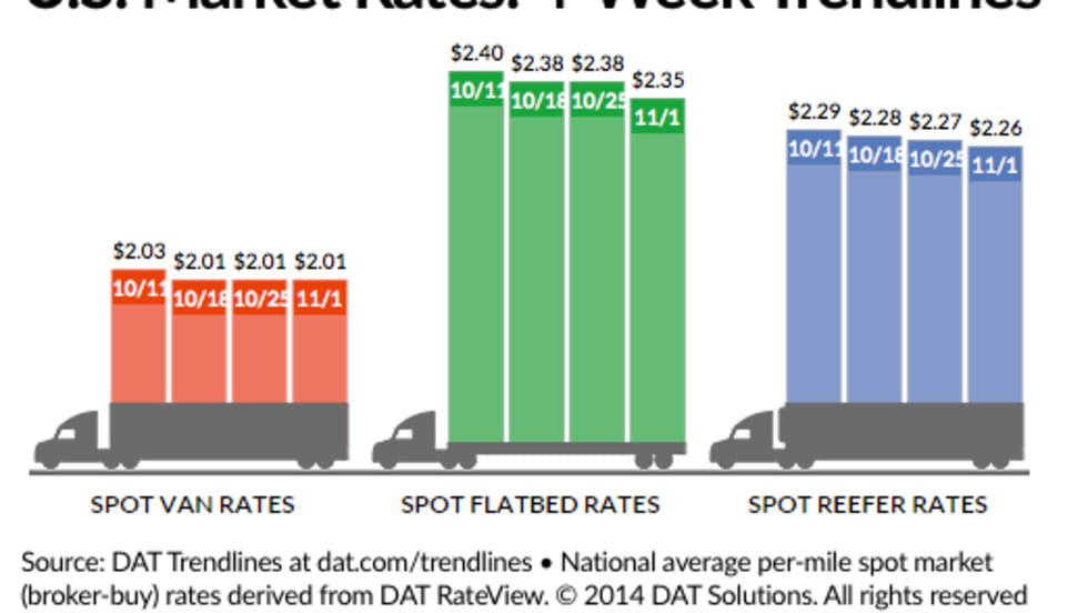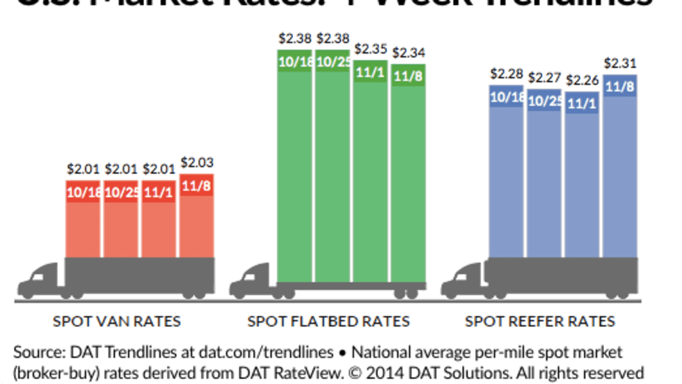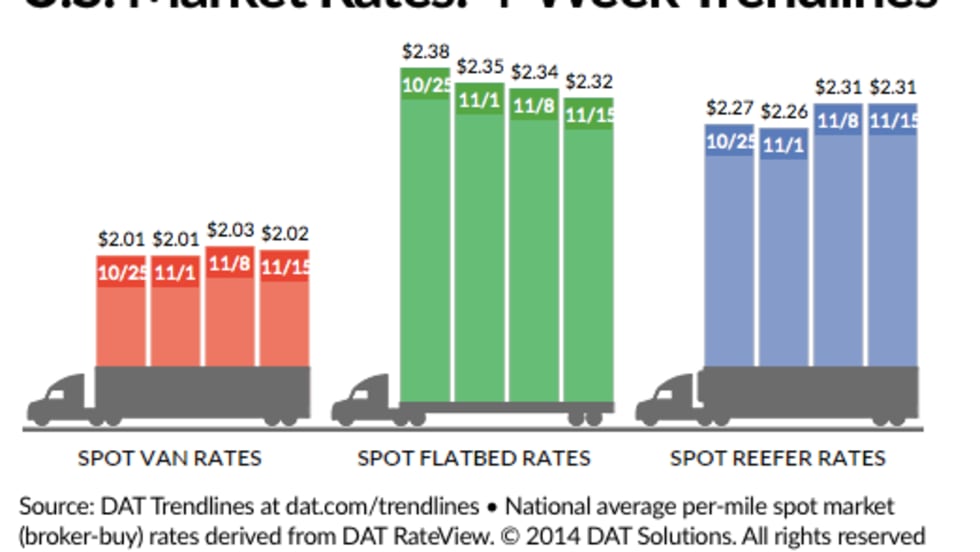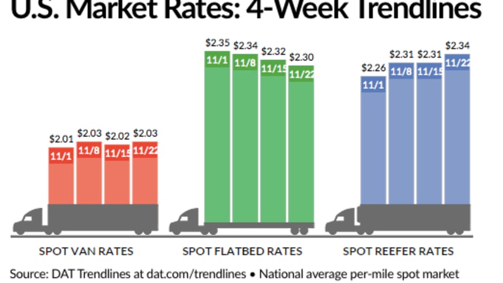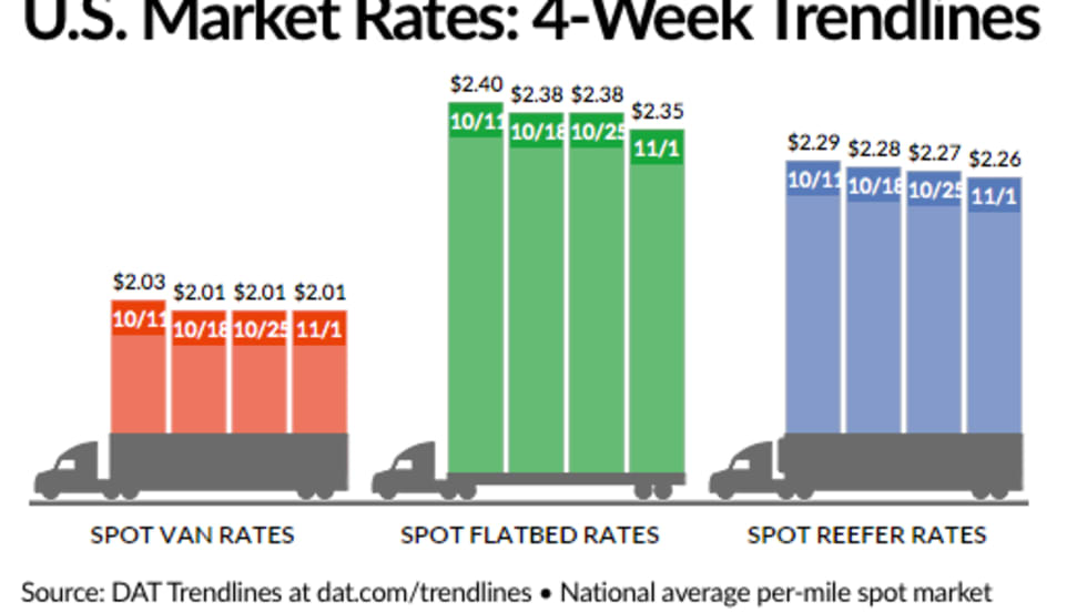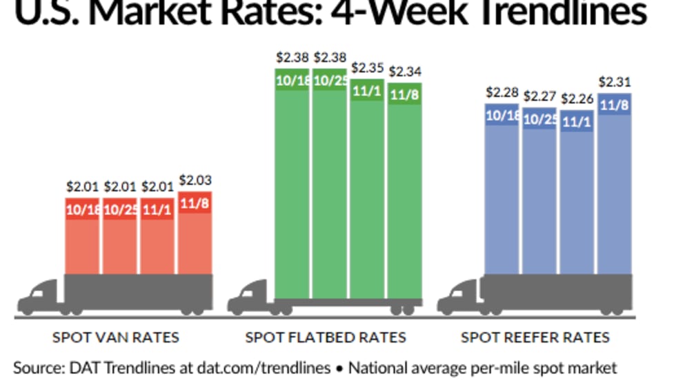 The average spot van rate on DAT load boards was unchanged at $2.01 per mile for the week ending Nov. 1 compared to the previous seven days, according to DAT Solutions, which operates the DAT network of load boards